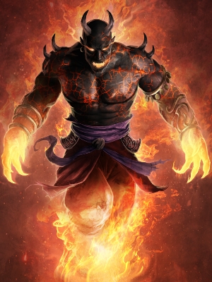 | Ifryty są na płomienie całkowicie odporne - ba, są im wręcz przyjazne! Wszelkie płomienie, gorąco i skwar nie szkodzi mu, a wręcz pomaga, przyśpieszając odbudowę ciała tam, gdzie życiodajny płomień mógł na chwilę zgasnąć przez nieczułe ostrze magicznej stali czy gdzie trafił go dziwny, bezlitosny pocisk magicznego lodu. Och, nie... płomienie są dobre i wręcz słuchają swych starszych, demonicznych braci-ifrytów! Sudżahid ma ciało wręcz uplecione z płomieni - wprawdzie może część ich zgasić (i na ogół to robi, odkrywając swą twarz i tors), ale jednak dalej jest to jego ciało i jego władza nad nimi. | |