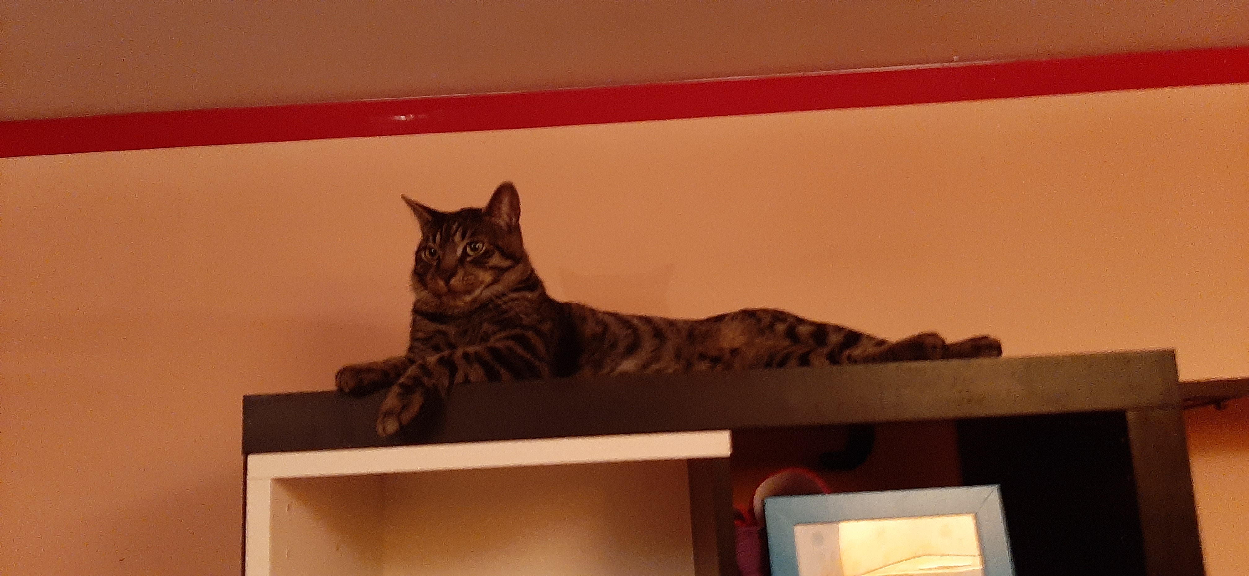 Historię ma smutną. Ktoś wyrzucił go jak śmiecia, był zamknięty w garażu podziemnym naszego budynku. Znaleźliśmy go w marcu, poszukiwania właściciela nic nie dały. Z resztą samo złapanie go nie było proste, nikt nie chciał pomóc, mam na myśli administrację i ochronę. No i cóż, sami go złapaliśmy, zawieźliśmy do weta, ważył 2kg, był wychudzony i przerażony, bał się ludzkiej ręki jakby ktoś go bił. Ale wyrósł nam chłopak przez te parę miesięcy i okazuje się, że prawdopodobnie jest krzyżówką z kotem bengalskim i przez to wygląda jak prawdziwy tygrys i choć dobija do 5kg naturę ma małego kociaka