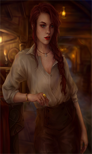 Dziewczyna, ze względu na swój stan majątkowy, ubiera się bardzo skromnie. Na tors naciąga poszarzałą koszulę, kupioną za pierwsze `zarobione` pieniądze, a na nią brązową, skórkową kamizelkę (tą po prostu ukradła). Na nogach nosi luźne spodnie z materiału, połatane w wielu miejscach, a na stopach znoszone już trzewiki. Poza tym zdarza się jej mieć niewielką sakiewkę oraz dobrze ukryty sztylecik.